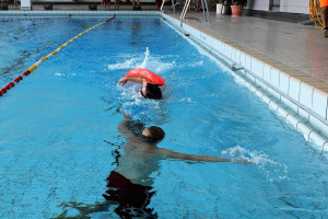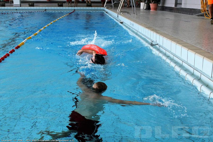 Neben unserem Informationsstand führten wir auch im Laufe des Tages mehrere Rettungsübungen im Hallenbad für die interessierten Badegäste durch. Dabei wurden sowohl der Rettungsgurt als auch die Rettungsleine in einer realistischen Rettungsaktion eingesetzt. Diese Übungen wurden sehr interessiert verfolgt.