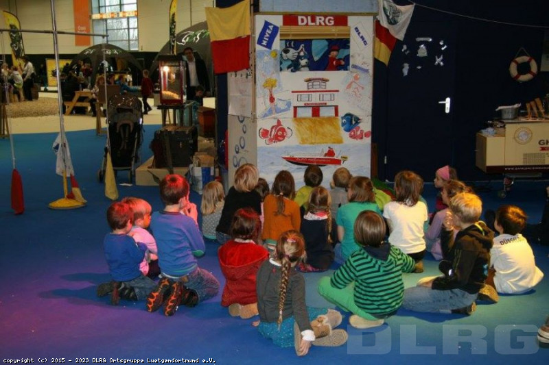 Die Messe „boot“ in der Landeshauptstadt Düsseldorf zieht Jahr für Jahr tausende von Besuchern an, die sich mit dem Element Wasser anfreunden. Neben Booten, Tauch- und Wasserskianlagen war auch der DLRG Landesverband Nordrhein mit einem Informationsstand vor Ort. Damit auch die ganz kleinen Besucher ihren Spaß haben sollten war das Kindergarten-Projekt-Team (kurz. KiGa) aus Lütgendortmund ebenfalls vom 24.01 bis 25.01.2015 dort. Die fünf ehrenamtlichen Lebensretter zeigten den Kindern dabei spielerisch die Gefahren des Wassers. Mit ihrem „Baderegeln-Express“ stellte das Team dabei die einzelnen Baderegeln dar und machte an jeder Baderegel-Station halt. Auch die Flaggen am Strand waren Bestandteil des Programms sowie das Absetzen eines Notrufs. Mit ihrem Theaterstück zog das KiGa-Team alle Blicke auf sich. Zusammen mit Rudi dem Retter und Nobby der Robbe besuchten die Kinder dabei gemeinsam einen Badesee und stellten dabei ihr Wissen über Flaggen und Baderegeln unter Beweis. Über das gesamte Wochenende erreichten sie dabei mehr als 230 Kinder. „Ein sehr tolles Ergebnis. Wir haben uns schon lange auf dieses Wochenende gefreut. Das wir so viele Kinder erreichen, hat uns positiv überrascht“, so Horst Baumann vom KiGa-Team.