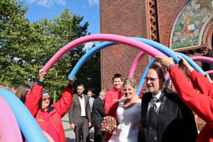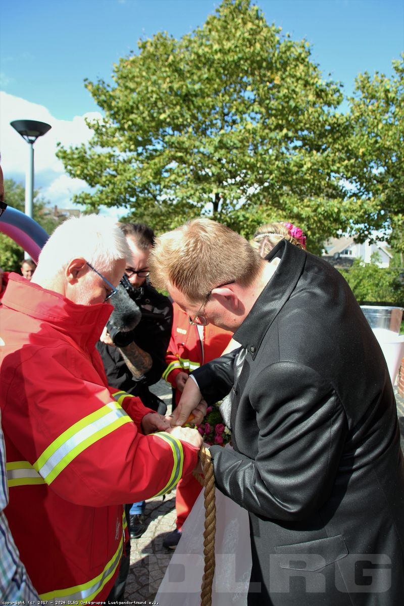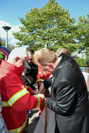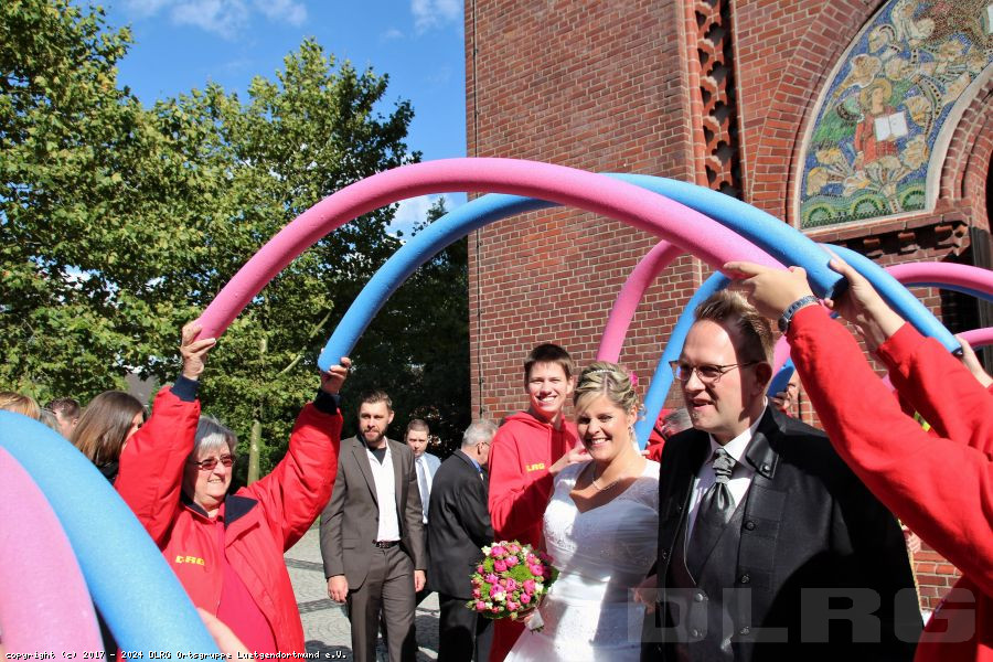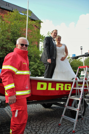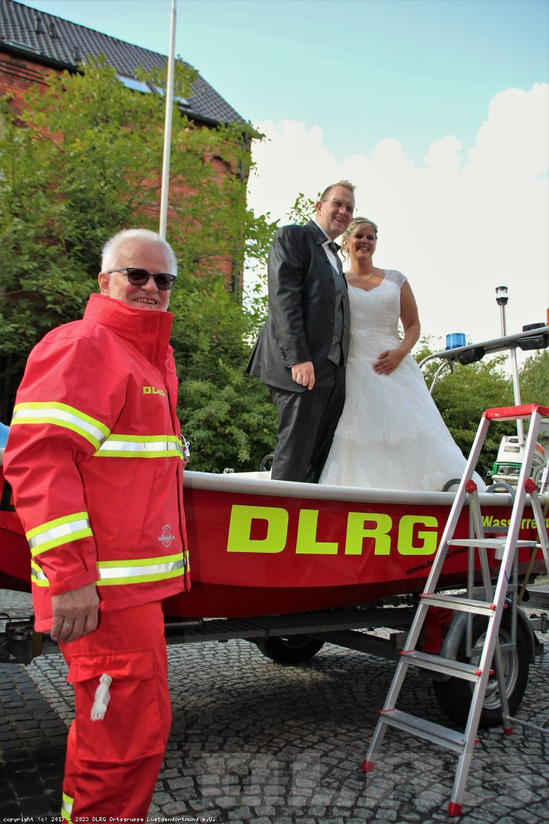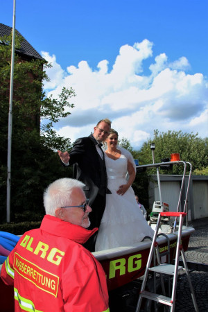 Mit Rettungsboot und Zugfahrzeug machten wir uns auf zur St. Magdalena Kirche in Lütgendortmund. Dort fand die Hochzeit von unserem Mitglied Yvonne und Marius statt.